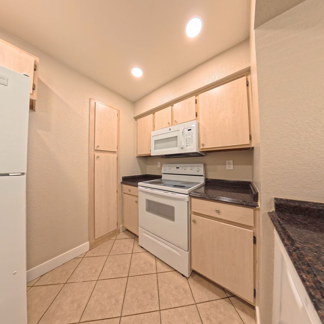 Enjoy a bright and functional kitchen with a breakfast bar and granite countertops. All appliances are included! Step outside to a covered patio overlooking the parking area—perfect for relaxing outdoors.