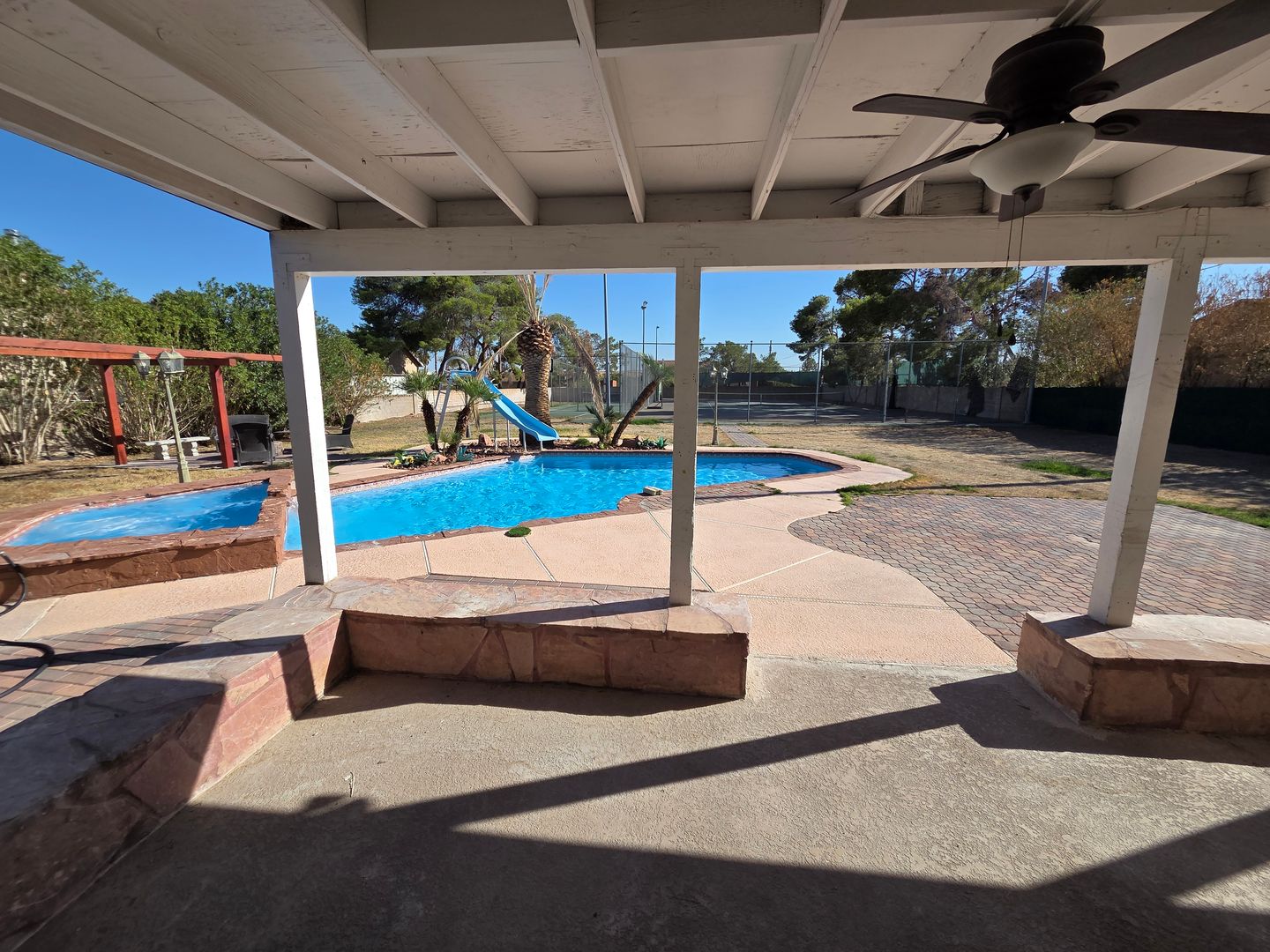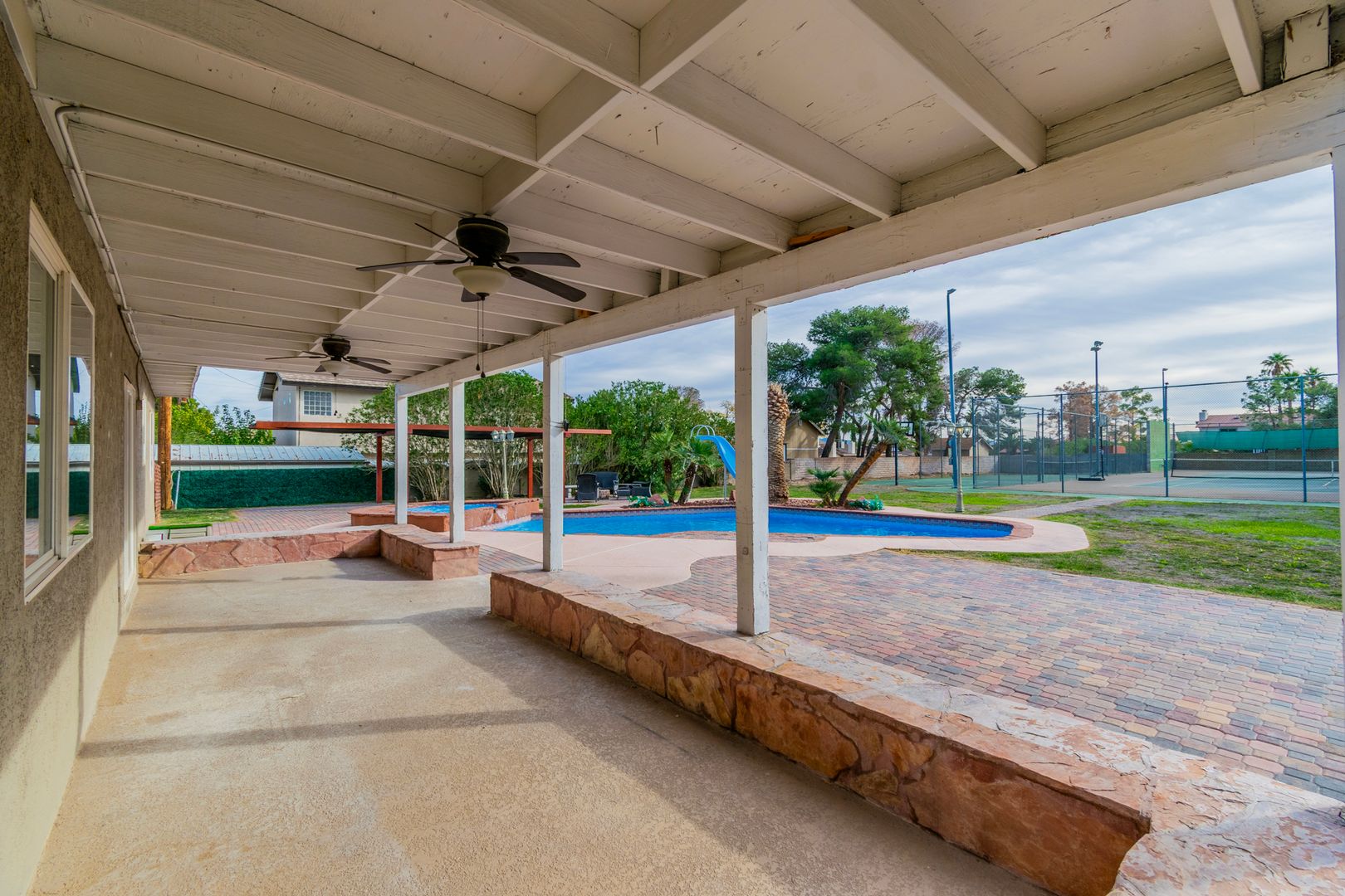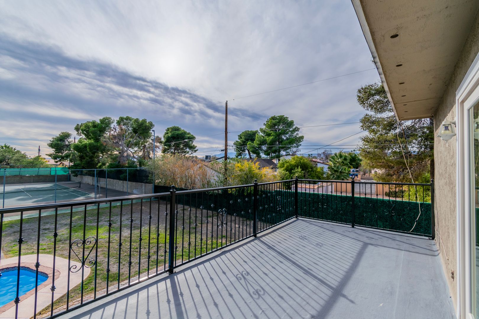 This beautifully remodeled home features 5beds and 5baths (4 full,1 half) with a bright, open floor plan designed for modern living. This home offers 2 master suites with walk-in closets, one on the main level and another upstairs with a private balcony overlooking the backyard. The kitchen is furnished with brand-new appliances and every detail has been thoughtfully updated. The open layout creates a welcoming atmosphere, while the generous bedrooms and upgraded finishes provide both function and elegance. The property includes a private guest casita complete with its own kitchen, full bathroom, living area, and closet. This space is ideally suited for use as a home office or entertainment area. Step outside to your entirely private, resort-style backyard that includes 2 tennis courts, a basketball court, a sparkling swimming pool, and a relaxing spa, all just steps from your door. Whether you’re looking for space, convenience, or a desirable lifestyle, this home truly has it all.